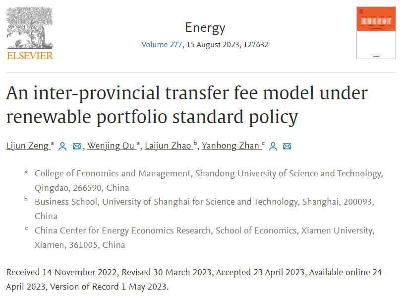 伟德体育官网博士生杜文静(导师:曾丽君教授)的论文“An inter-provincial transfer fee model under renewable portfolio standard policy”在能源与管理领域国际期刊《Energy》(SCI,IF=9,中科院JCR一区)发表。