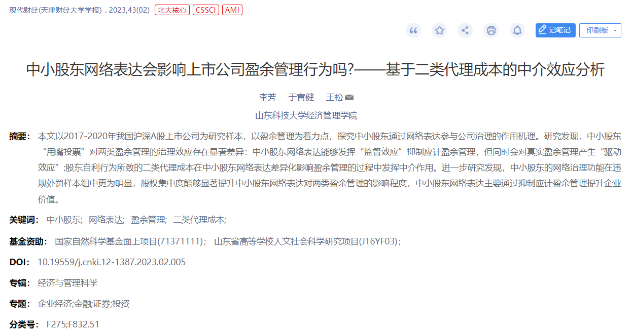 伟德体育官网硕士生于寅健(导师:李芳副教授)的论文“中小股东网络表达会影响上市公司盈余管理行为吗?——基于二类代理成本的中介效应分析”在经济学领域中文期刊《现代财经》(天津财经大学学报)(CSSCI,IF=4.7)发表。
