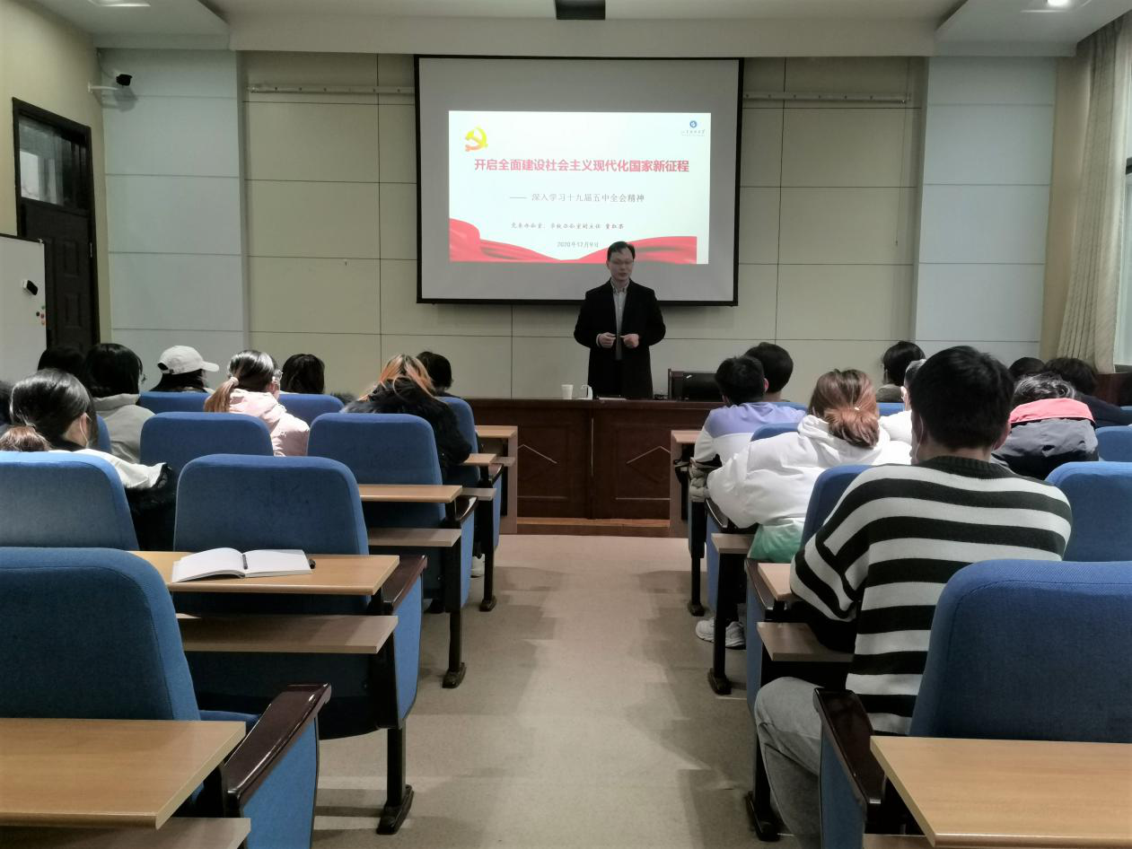 12月9日,学校党委办公室(学校办公室)副主任贾红果在学院楼二楼会议室为投资学专业2019-1班的同学进行了党的十九届五中全会精神宣讲。