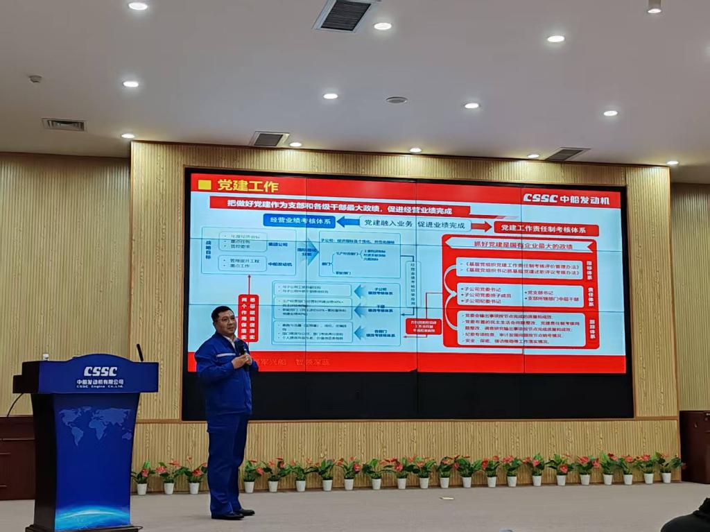 参观结束后,中船发动机有限公司营销质量党支部书记张军伟以“党建引领绿色动力创新,产研协同服务国家战略”为题作专题报告。报告重点解读了公司“五四三一”BV伟德官方网站体系的核心内涵——即五个融合促发展、四个作用聚合力、三个保障强根基、一个目标领方向,系统介绍了营销质量党支部在强化党建引领、凝聚支部合力、推动党建与业务深度融合等方面的实践经验,分享了企业在绿色动力技术研发、产业链协同创新等领域的丰硕成果,彰显了BV伟德官方网站对企业高质量发展的引领保障作用。