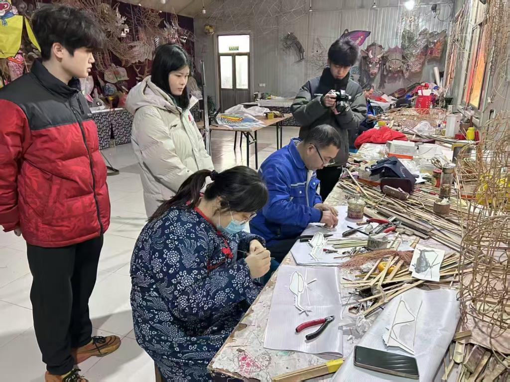 在国家级非遗传承人郭洪利的风筝作坊内,团队成员详细了解到潍坊风筝的深层定义、融合发展以及国际价值。期间,郭洪利老师还着重提到“风筝是载体,利用潍坊风筝的技艺融合多元文化是关键!”强调只有把古老技艺与现代元素相结合,才能吸引年轻人关注,让传统文化重焕生机与活力。