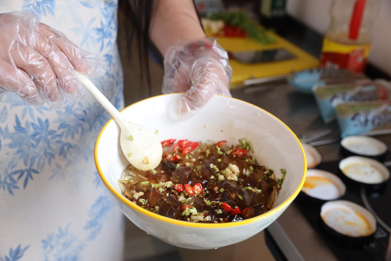 在杨掌柜海洋科技有限公司参访期间,公司负责人李丽精心准备了海鲜酱、青岛凉粉等具有地方特色的主打产品供品鉴。负责人李丽与抖音达人“刘老六不是很6”围绕品牌建设展开深入探讨,重点阐释了“利他主义”对企业可持续发展的重要意义,同时就新媒体营销策略、直播带货技巧等实务问题进行交流。随后,团队成员实地参观了标准化凉粉加工车间,系统观摩了从原料处理到成品包装的全流程生产工艺。