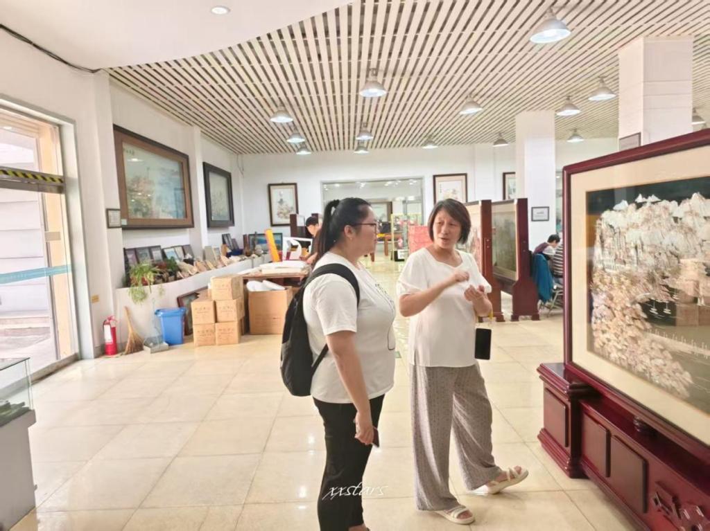 7月18日,在朱晓蕾经理的带领下,实践团队前往青岛贝雕艺术馆进行参观学习。艺术馆展厅内,各类贝雕精品琳琅满目,大型贝雕屏风《万里长情》以精湛工艺复刻长城雄姿,巧妙运用贝壳天然色泽还原历史厚重感;展现青岛地域特色的《青岛风光》通过螺钿拼贴工艺,生动呈现出海滨城市的灵动之美;融合现代设计理念的贝雕首饰系列作品,诠释了传统工艺与时尚元素的创新结合。参观过程中,团队成员了解到,青岛贝雕精选本地扇贝、鲍鱼壳等原材料,经过选料、设计、雕琢、抛光等30余道严谨工序精制而成,其中“点螺”“平磨”等传统技法尤为精湛,能使普通贝壳呈现出堪比玉石般的温润光泽与独特质感。