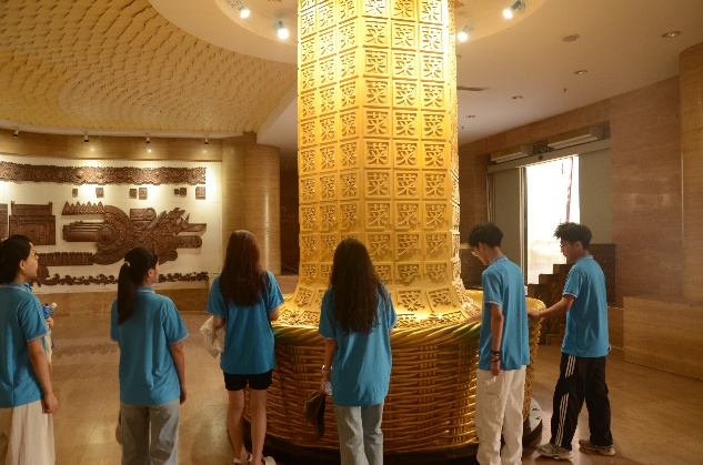 实践队按照序厅、古代历史区、蔬菜大观区、科技创新区、展会文化区、蔬菜与饮食区等板块的顺序进行参观学习。步入序厅,队员们立即被场地中央刻有“菜”字样的金色立柱吸引,该立柱向参观者表示蔬菜产业对寿光发展具有举足轻重的作用。